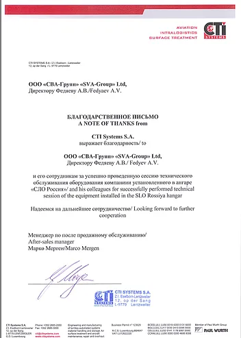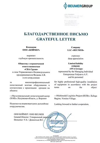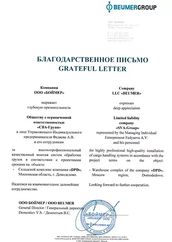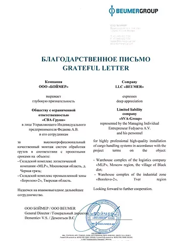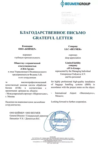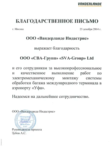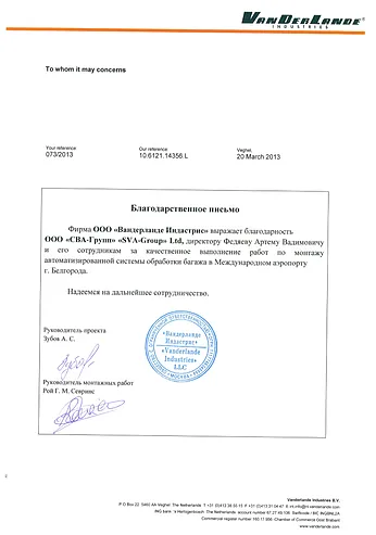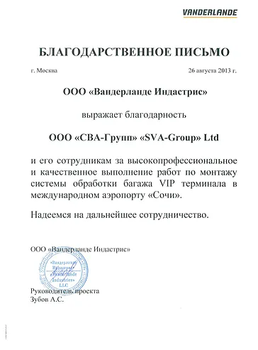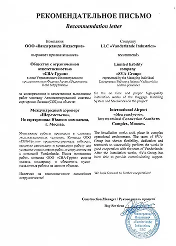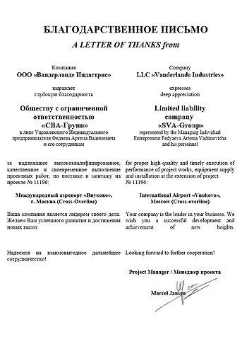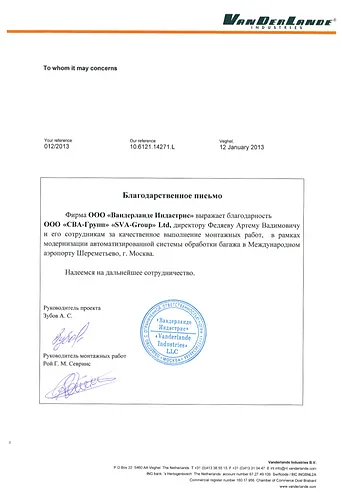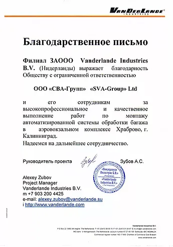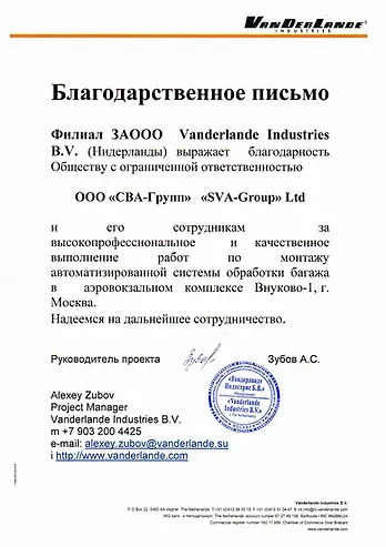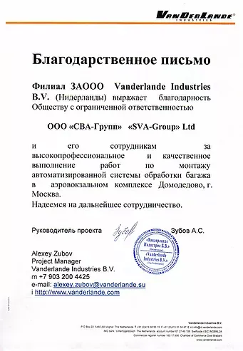 Our long-term partner, Vanderlande Industries, after leaving and completing commercial activities on the territory of the Russian Federation, entrusted our company with the further maintenance of Vanderlande equipment, which is confirmed by the issuance of a certificate.